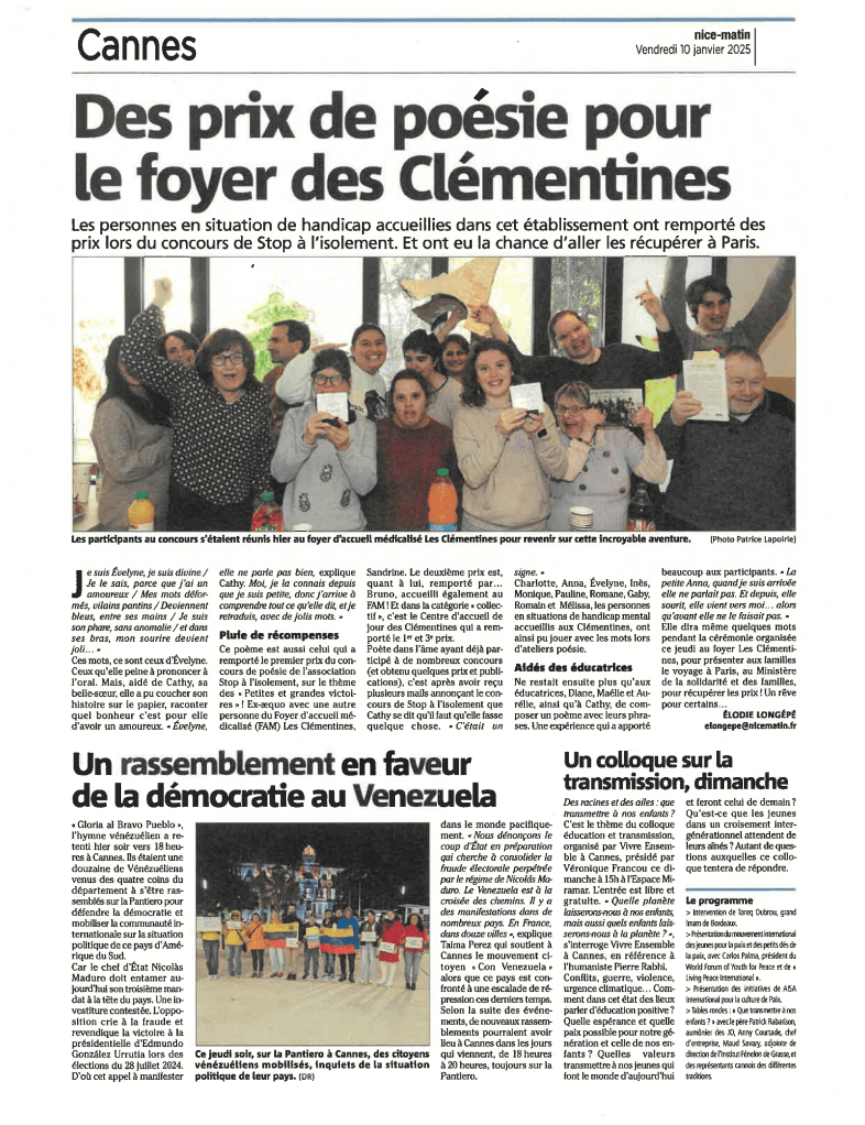 janvier 10, 2025 8:33 amLes résidents du Foyer d’Accueil Médicalisé Les Clémentines à Cannes ont participé au concours de l’association Stop à l’Isolement à Paris. Leurs poèmes ont été distingués et ont reçu plusieurs prix.